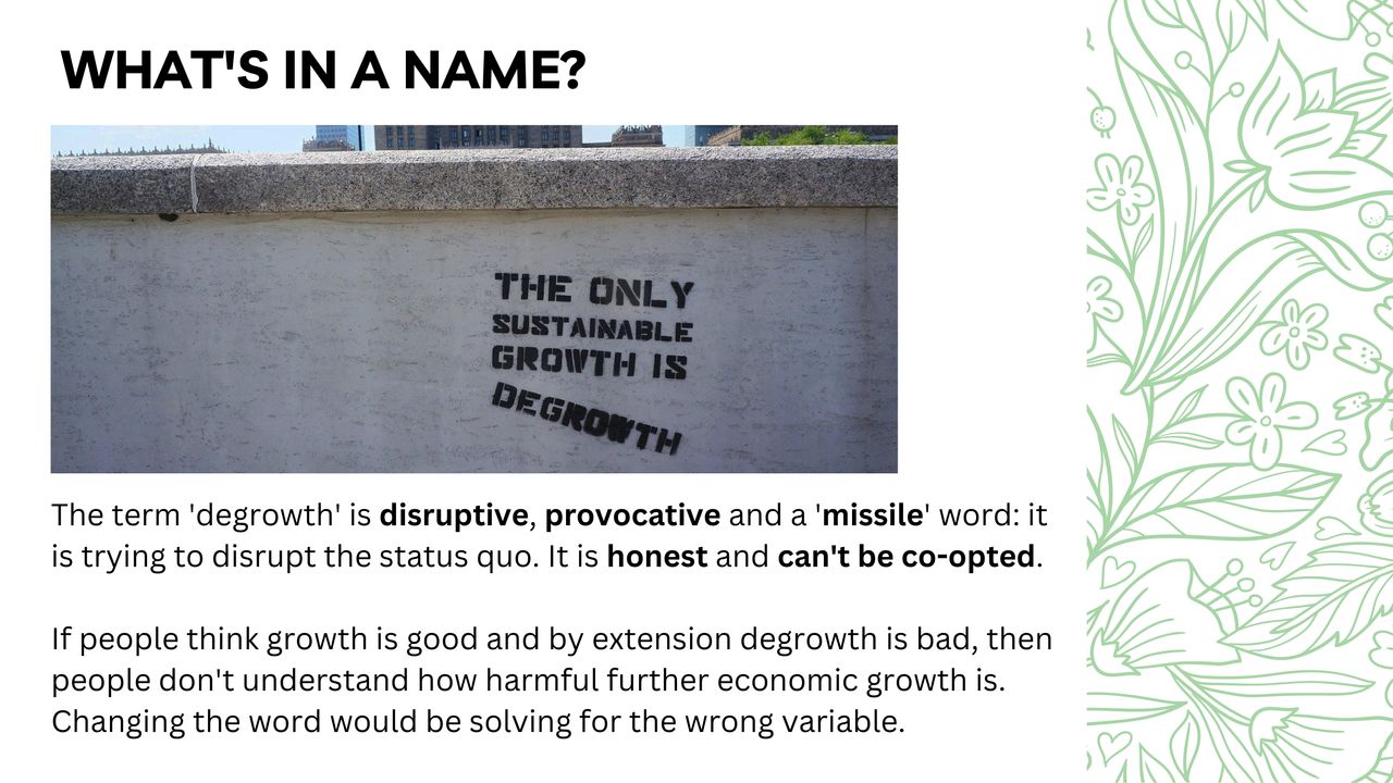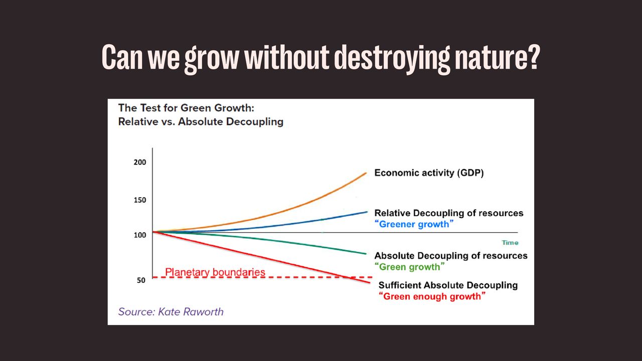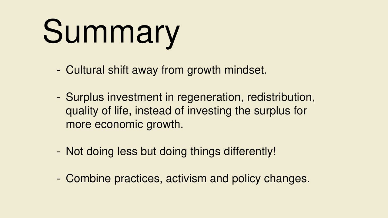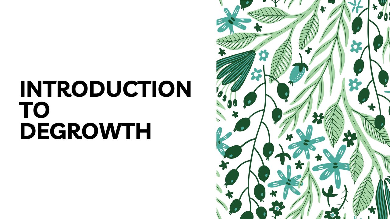 This presentation is a wonderfully visualised story of growth and degrowth. This presentation is perfect for an introductory workshop or talk about degrowth. These slides were made by Erin Remblance (external link), co-founder of (re)Biz (external link) "the most (re)volutionary leadership workshop on the planet".
