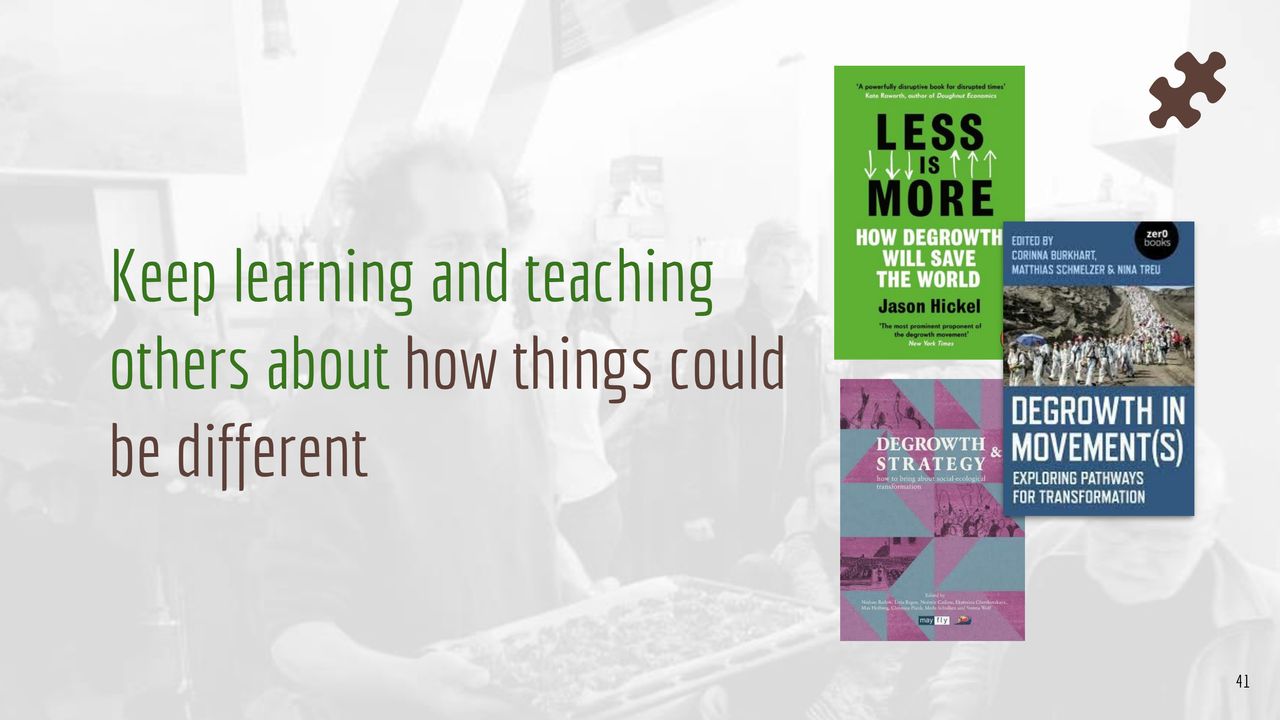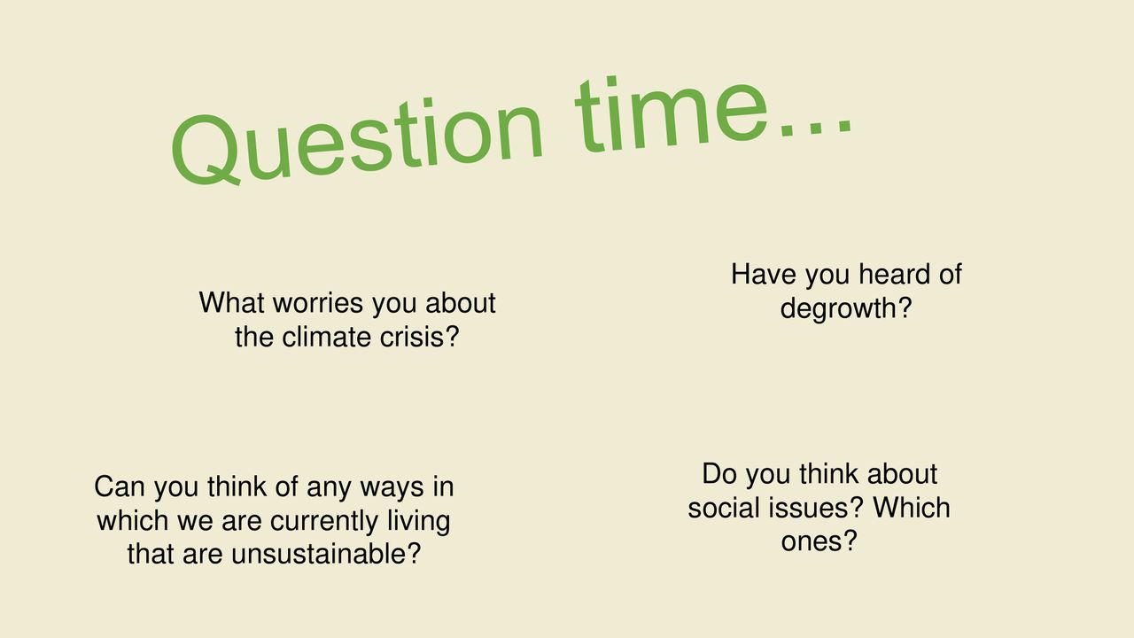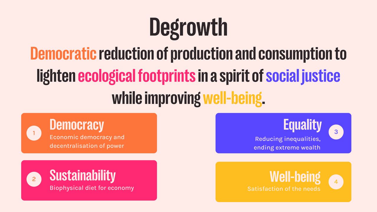 This treasure trove of degrowth presentation slides is freely available for download, designed to empower you to inspire change, challenge the status quo, and engage audiences towards taking collective action. So go put yourself out there! Classrooms, community meetings, HOAs, online forums, churches, mosques, synagogues, city halls, Sunday BBQs, and workplaces all count.
