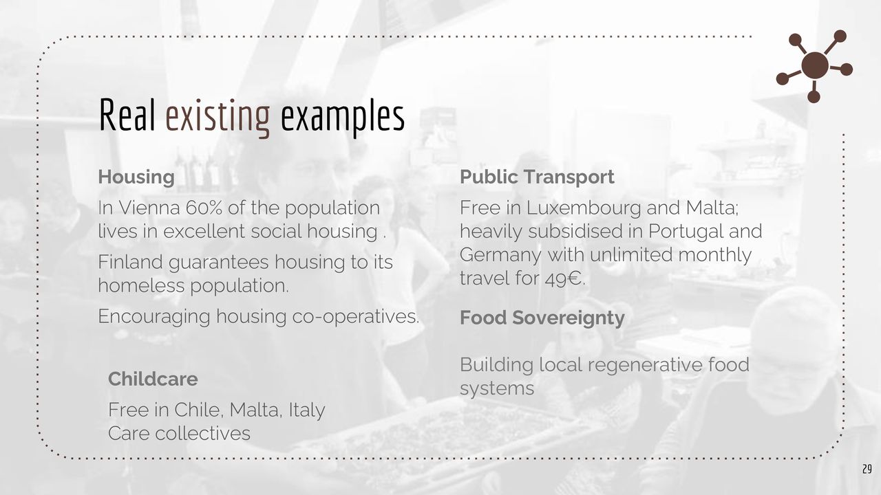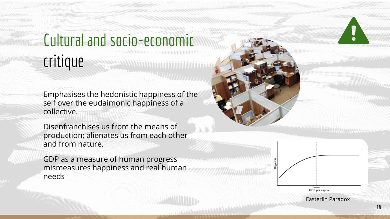 This beautiful presentation starts with critiques of a growth-based society, then presents a hopeful vision for a degrowth society and ends with actionable strategies for systems change. This presentation is perfect for a slightly more eco-conscious audience. These slides were made by Tadeáš Žďárský a member of Nazemi (external link), an organisation promoting degrowth ideas (among many other things) in the Czech Republic.
