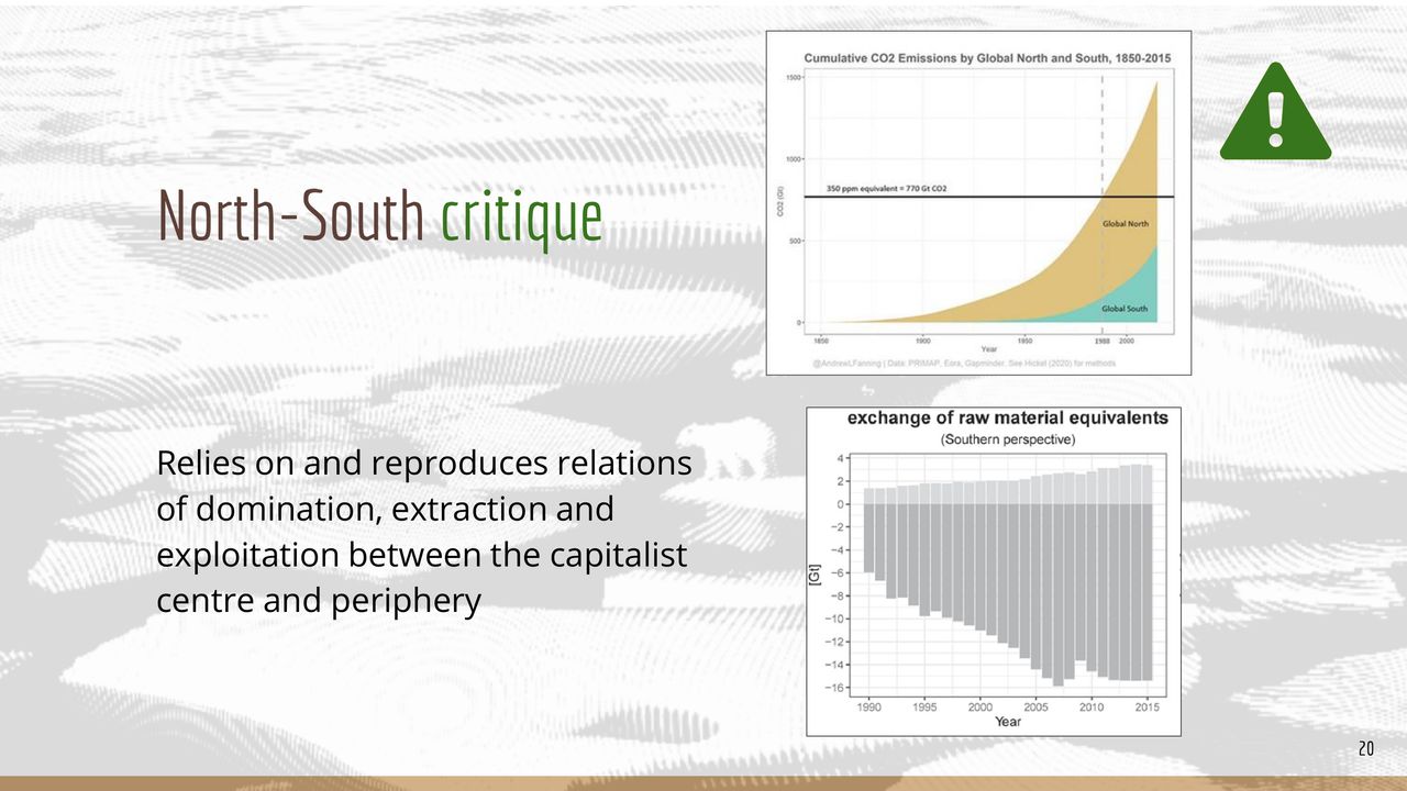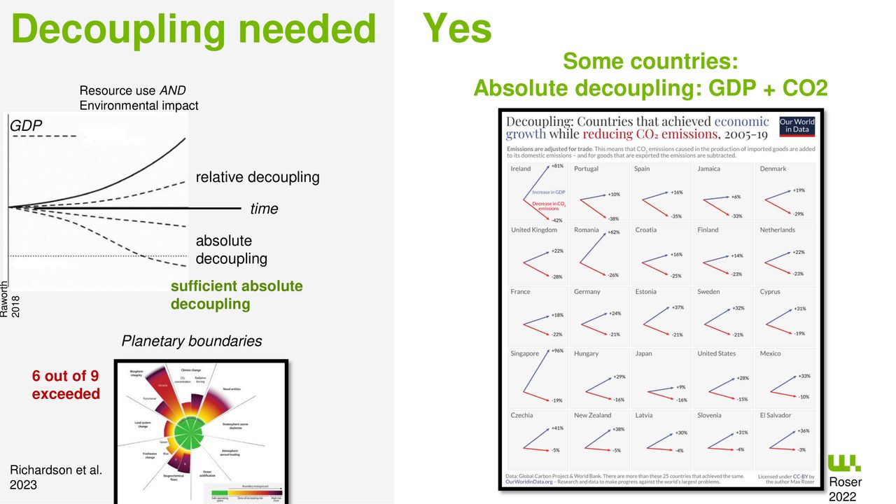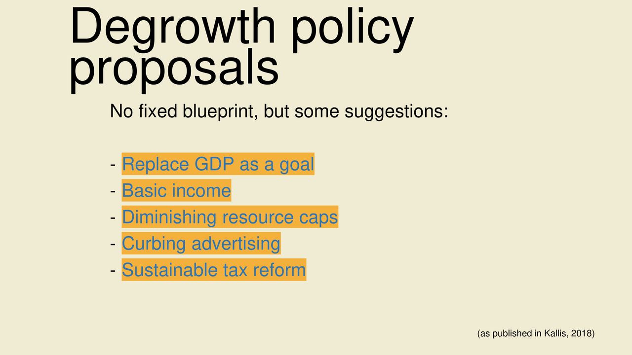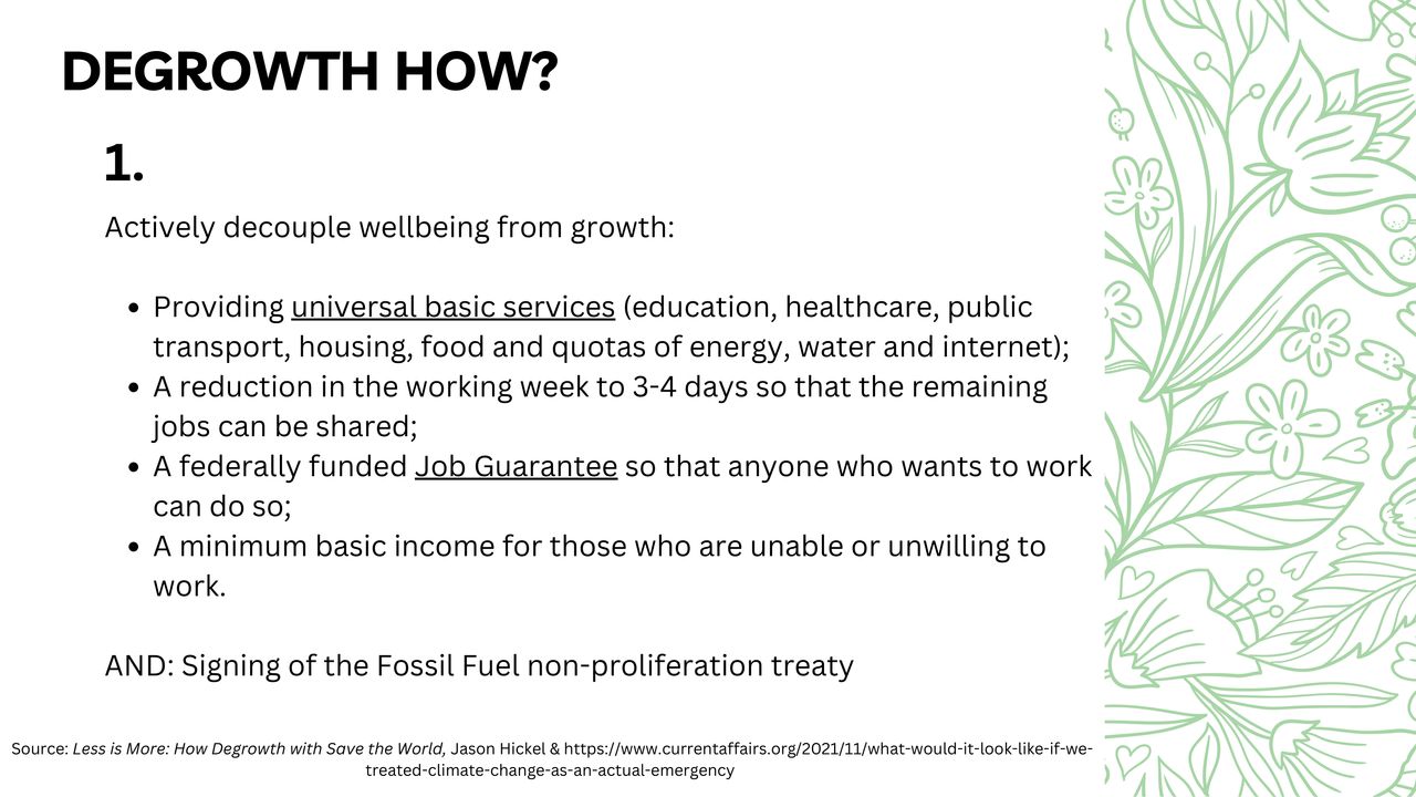 This presentation is more complex than the others yet gives a detailed overview of degrowth, policy proposals and critiques of growth. This presentation is perfect for a more academically inclined audience. These slides were made by Valentin Sagvosdkin (external link) a researcher at the Berlin University of Applied Sciences.